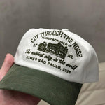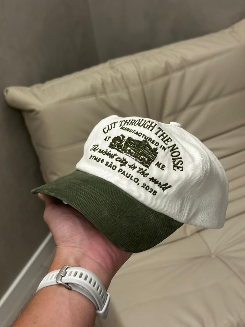 O Boné Cut Through The Noise é a primeira peça da nossa nova coleção e do novo ano da ATME. Com uma estética clássica e execução moderna: frente estruturada em algodão cru, aba verde texturizada e bordado em tom militar que carrega a identidade ATME.