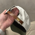 O detalhe em couro com regulagem metálica adiciona peso visual e acabamento premium. É aquele tipo de peça que parece simples… até você olhar de perto.
